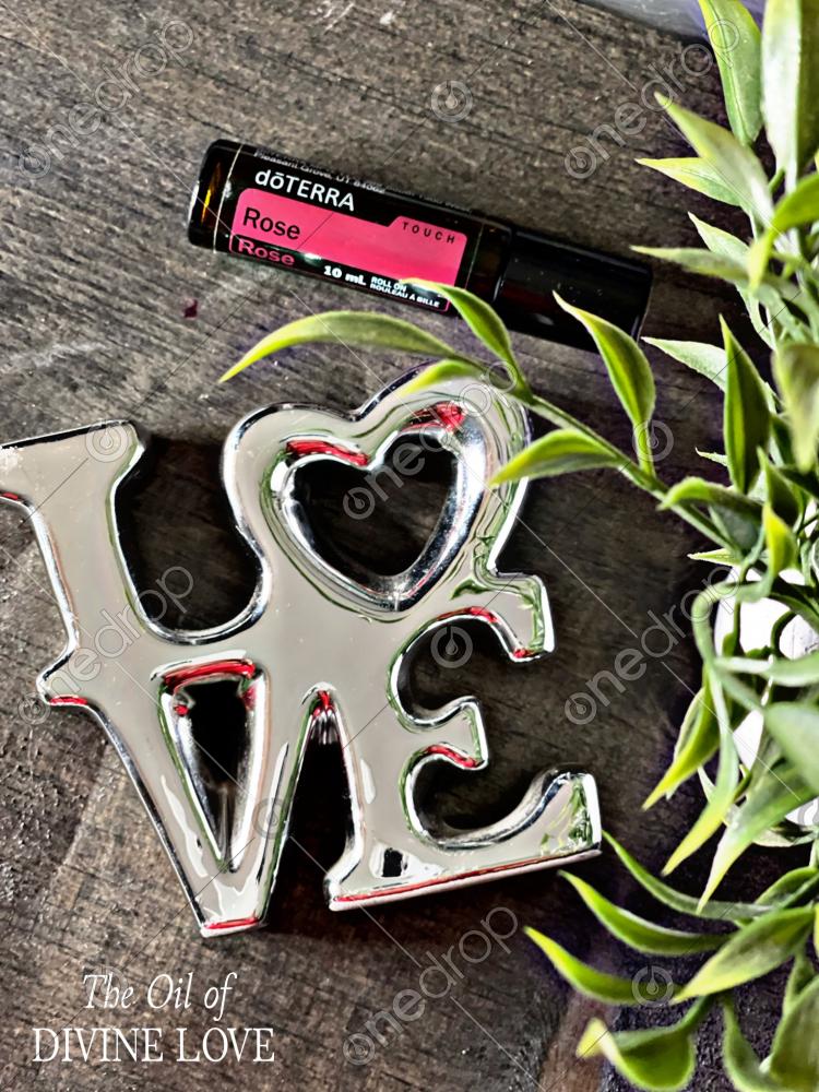 Love Sign displayed with rose touch with words written on image - "THE OIL OF DIVINE LOVE" with some greenery