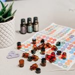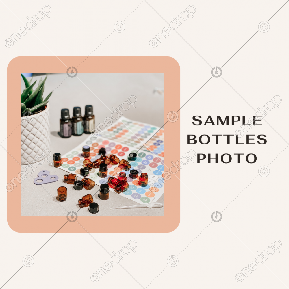 Lifestyle Photo showing sample bottles stickers With oils in the background.
