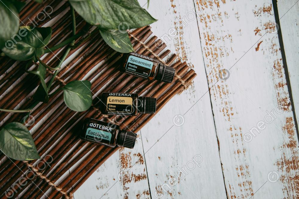 1 photo with 15 ml bottles of Spearmint, Lemon, and Eucalyptus on wood with plant and ship lap background