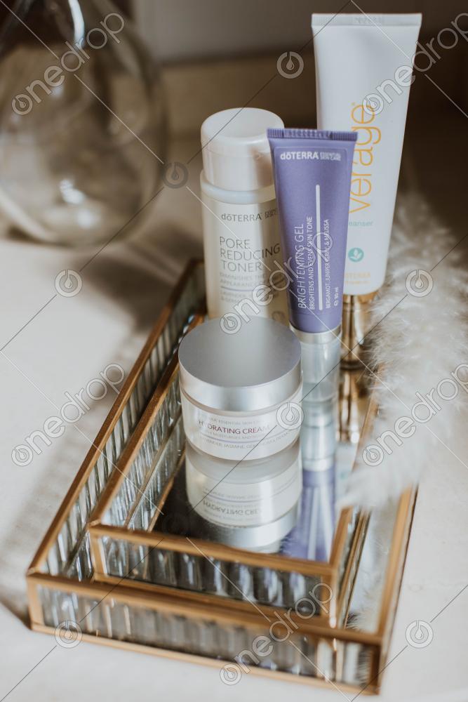 Verage face cleanser, pore reducing toner, hydrating cream and brightening gel on a bathroom sink.