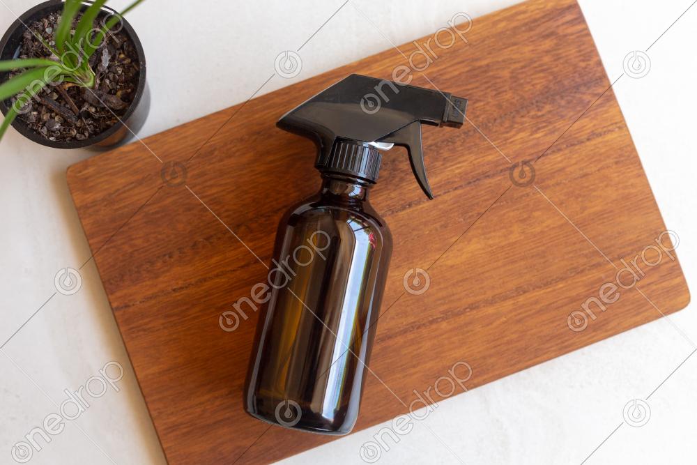 Use this image of a single spray bottle on a wood chopping board to advertise spray bottle classes, recipes, and more!