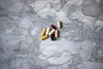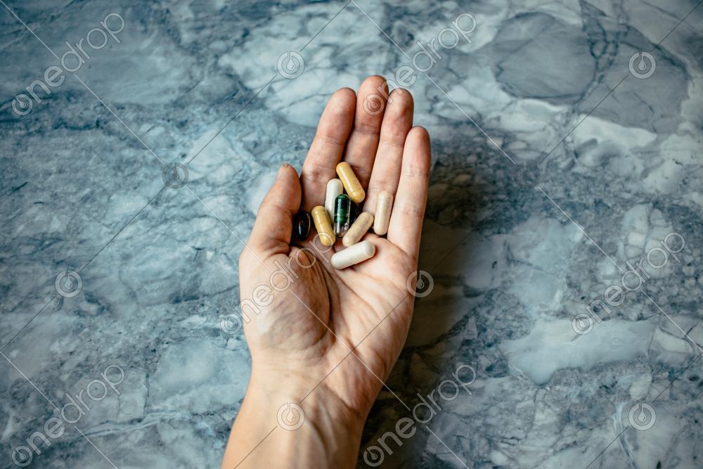 4 different lifestyle photos of Doterra Supplements line on a minimal grey marble background.
