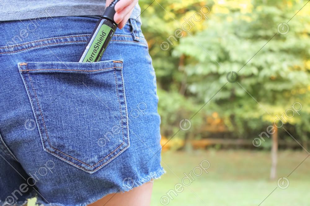 doTERRA TerraShield® Spray in the back pocket of denim shorts, pictured outside.