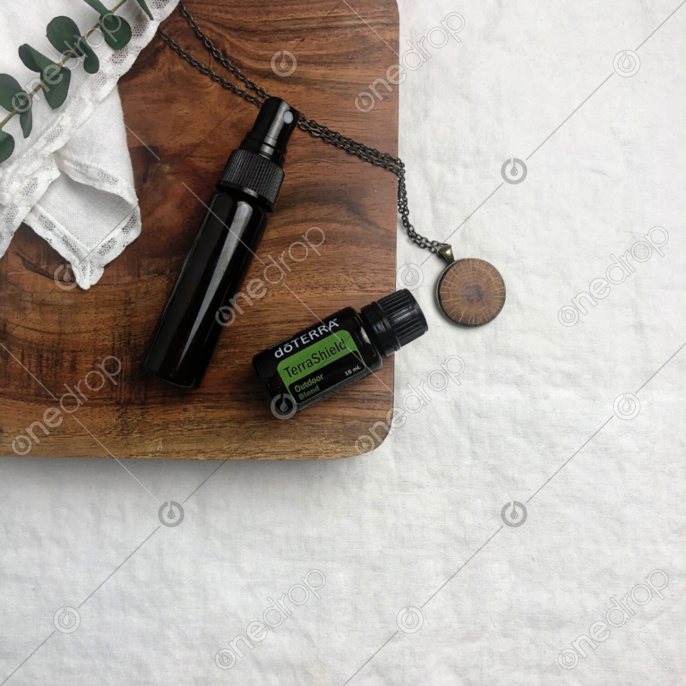 TerraShield w/Spray + Diffuser Necklace. White space to add your own text/bug spray recipe.