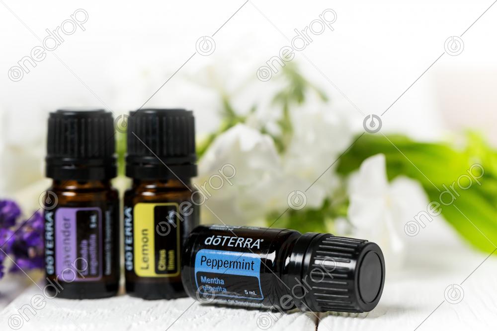 Three bottles of essential oils - Peppermint in focus, Lemon and Lavender on blurred background