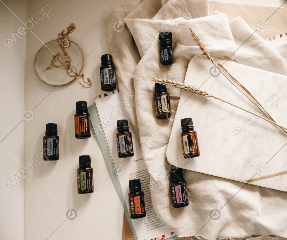 The top 10 oils laying on a magazine and linen. Image includes jewellery & marble board.
