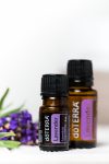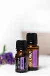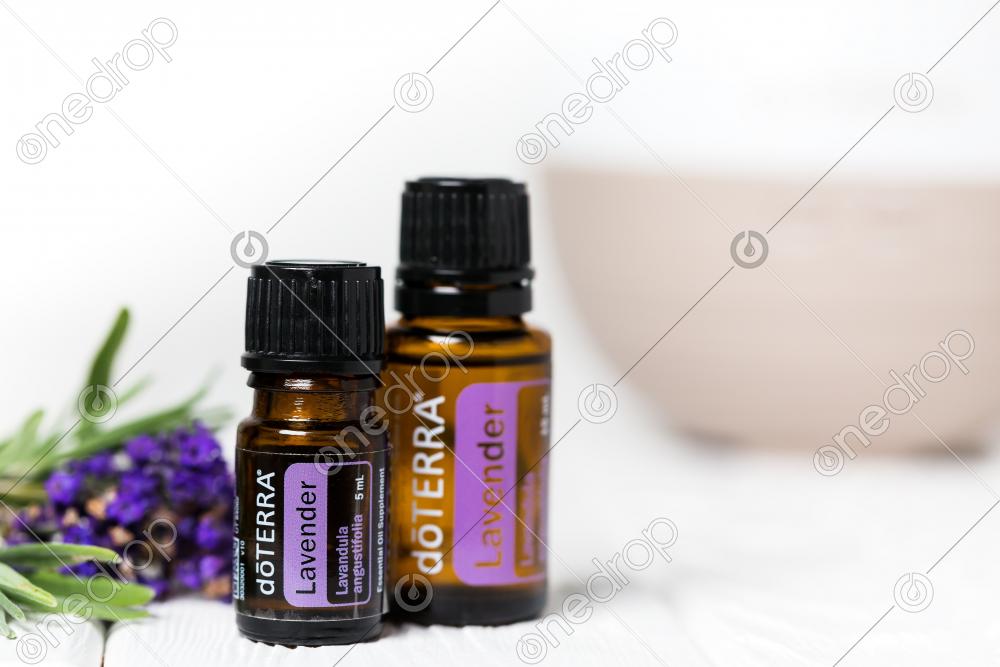 Two bottles 5 ml and 15 ml of essential oil dōTERRA Lavender, set of photos