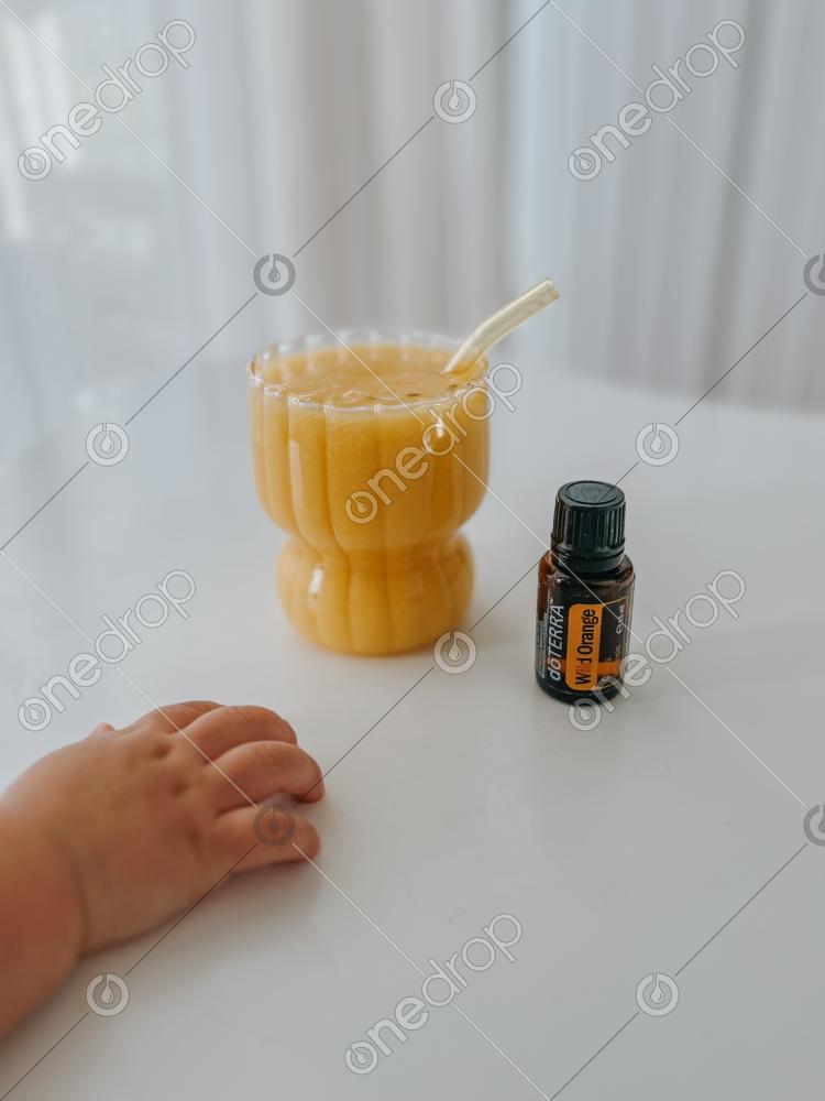 Wild Orange for juice flavouring and a toddler's hand in frame.