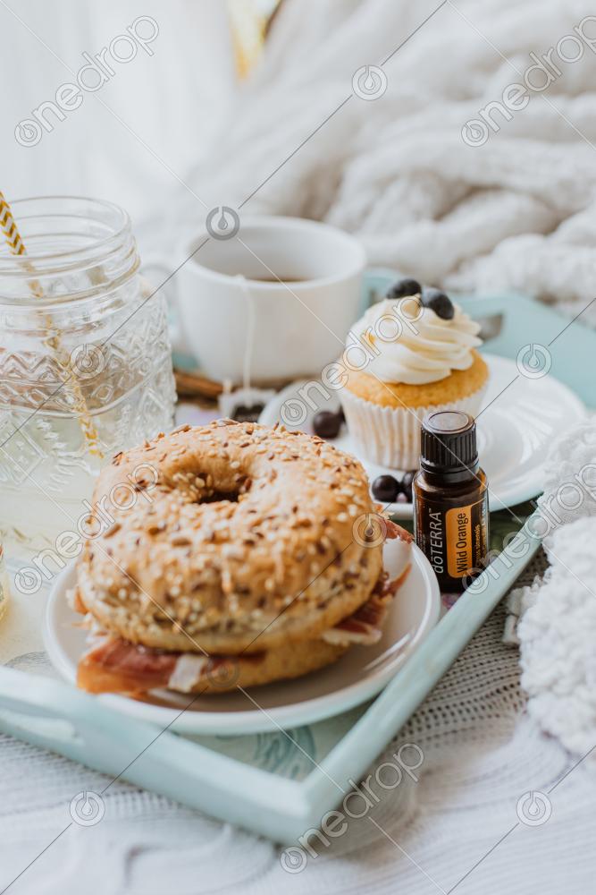 A tray with breakfast or brunch and wild orange. Bagel with prosciutto, cupcake, tea, and lemonade