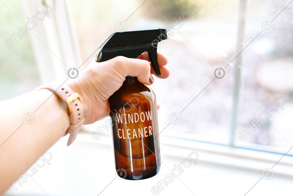 Lifestyle Image of Window Cleaner in an amber glass spray bottle.