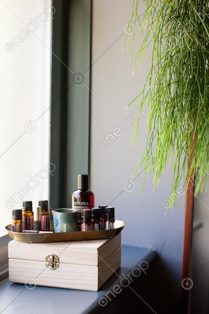 Windowsill Selection of Essential Oils for Aromatic Dressing