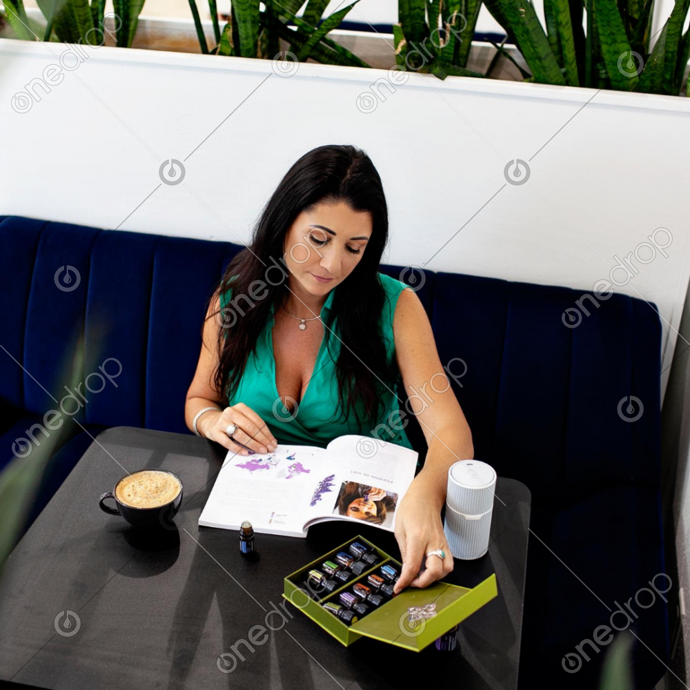 Lifestyle of woman sitting with coffee, healthy start kit, pilot diffuser and doterra catalog.