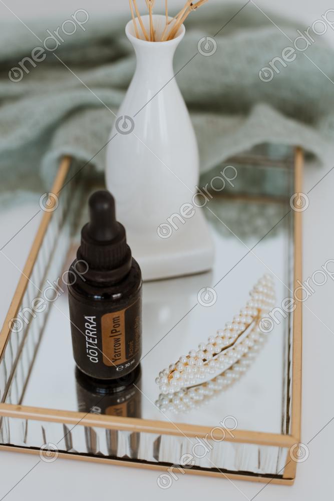 Yarrow Pom on a mirror bathroom tray with flowers, a vase, and a hairpin.