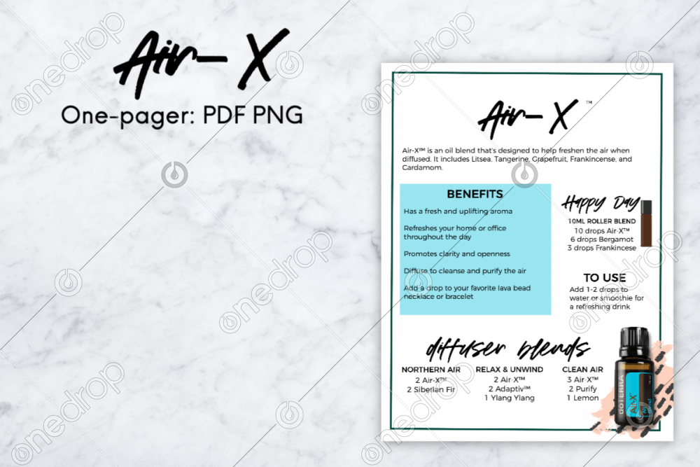 One page sheet for Air-X, includes: Information about the oil Benefits & uses One roller bottle blend Three diffuser blends PDF & PNG format Find additional Air-X graphics here: square or story bundle **please watermark images to protect your investment If you have a request or comment, please use “provide feedback” to email me. If you want me to address you specifically, please include your contact info for a reply.