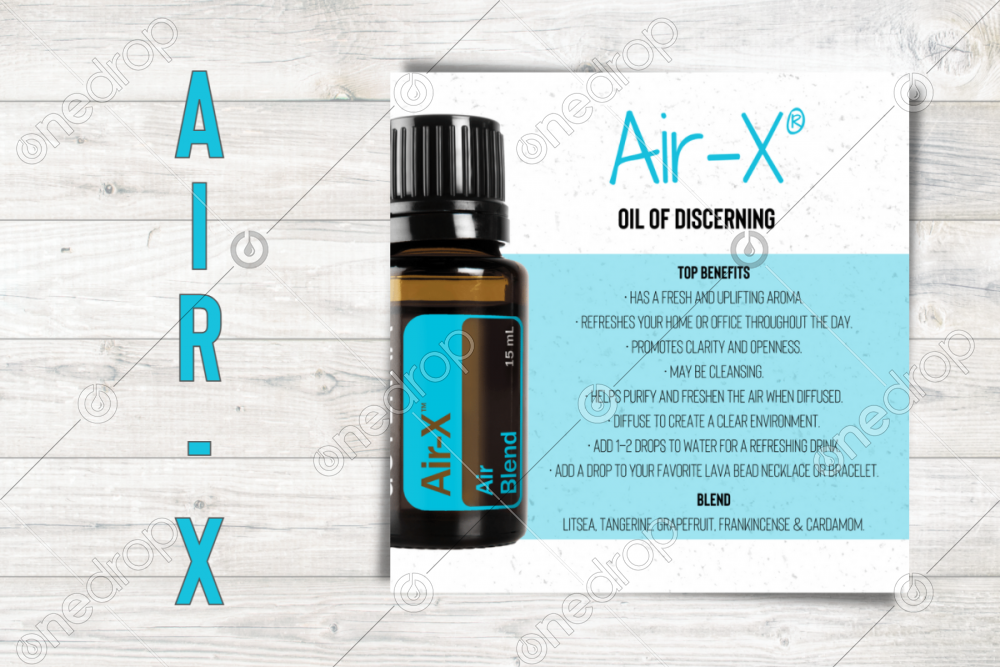 Square infographic with benefits & usage tips for Air-X Essential Oil Blend.