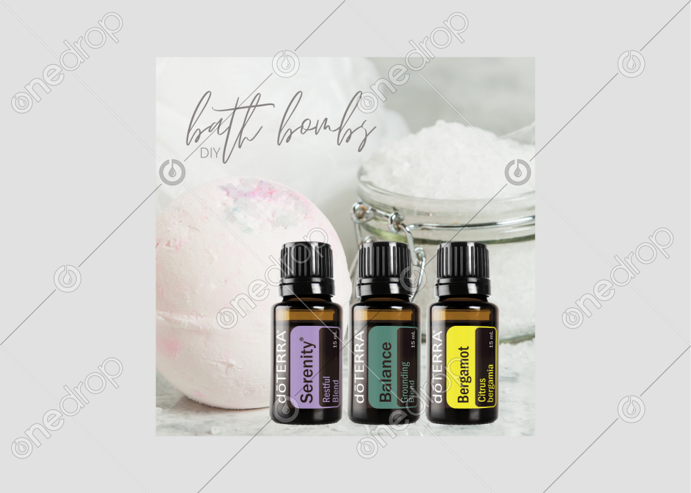 Square image graphic that says, "bath bomb DIY" with dōTERRA Balance® Oil, Bergamot Oil, and dōTERRA Serenity® Oil displayed.