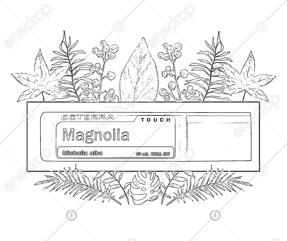 Black and white sketch image of Magnolia roll on surrounded by floral decoration