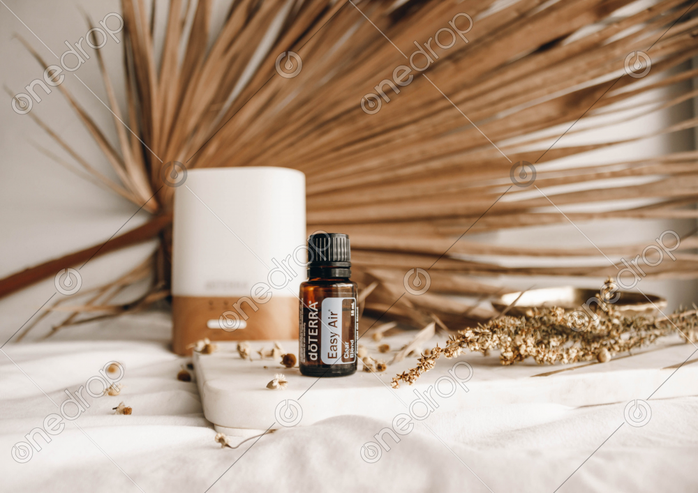 High Res image of Easy Air standing on a marble board with Lumo diffuser, dried palm leaf in background.