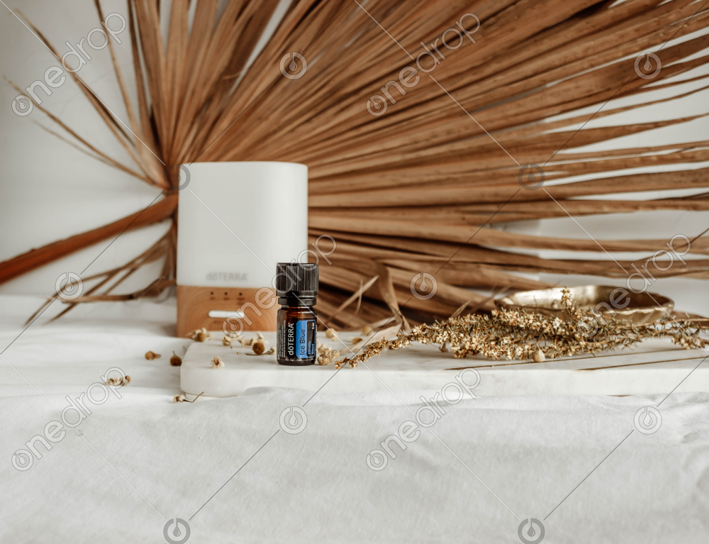 High Res image of Ice Blue standing on a marble board with lumo diffuser, dried palm leaf in background.