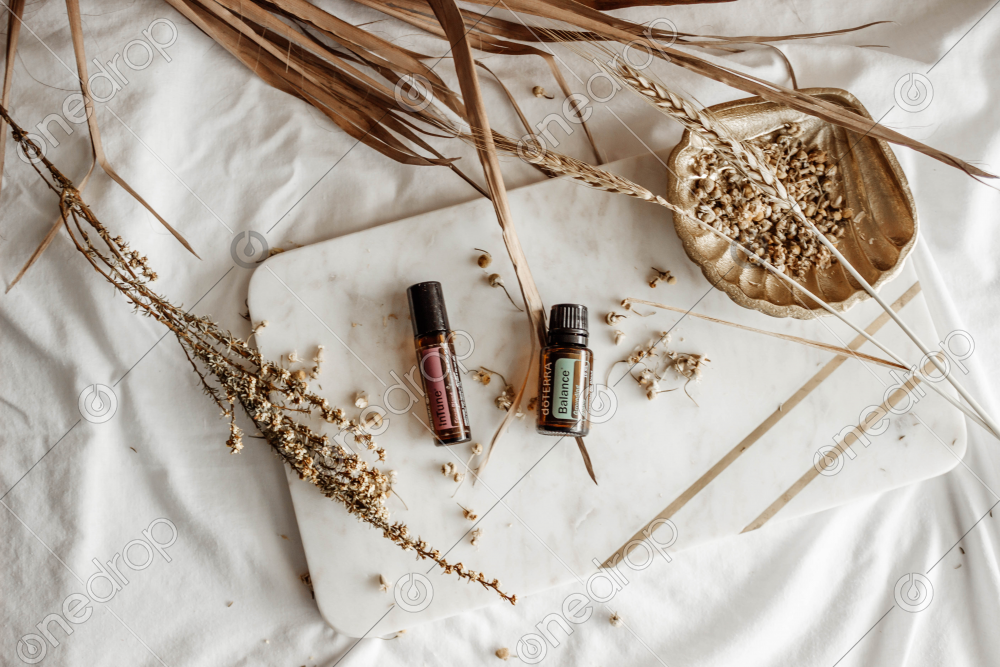 InTune & dōTERRA Balance Flatlay with Palm Leaf and Dried Flowers