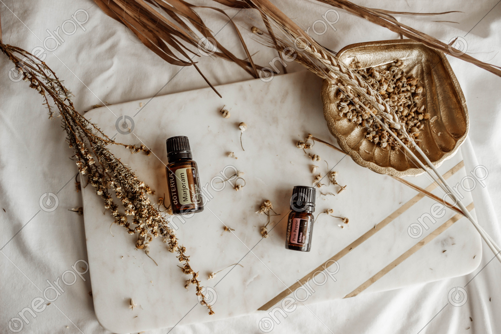 High Res image of Marjoram and Pink Pepper flatlay standing on a marble board with dried palm leaf in background.