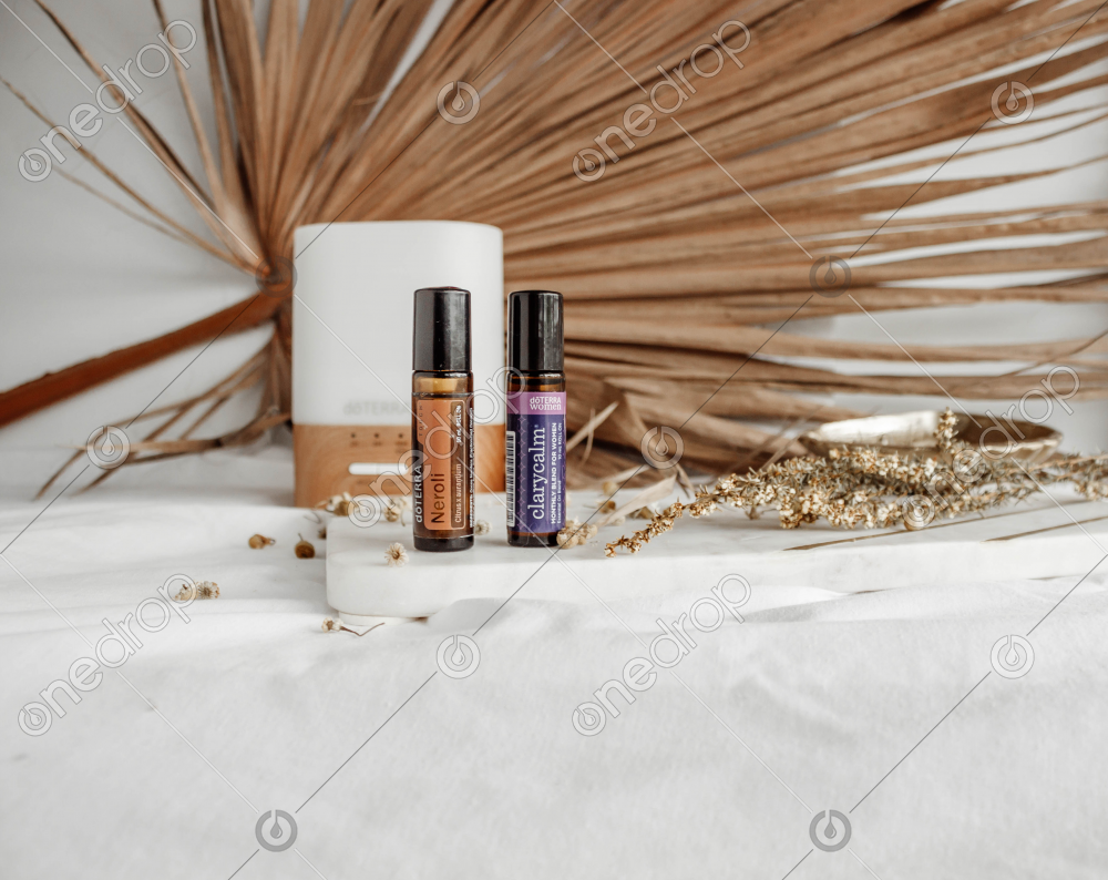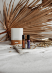 High Res image of Neroli Touch & Clary Calm standing on a marble board with dried palm leaf in background.