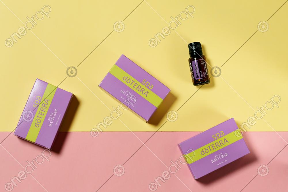 dōTERRA Serenity Bath Bar and Serenity Essential Blend bottle 15ml flat layout on color background