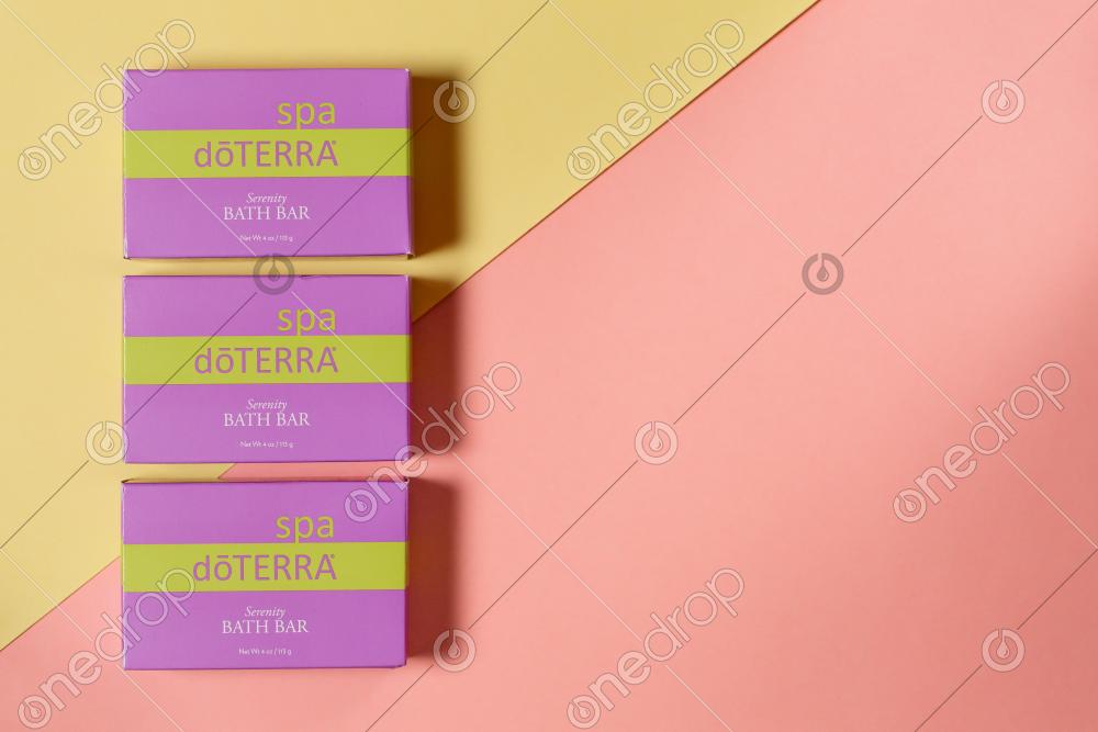 dōTERRA Serenity Bath Bar flat layout on color background with copy space