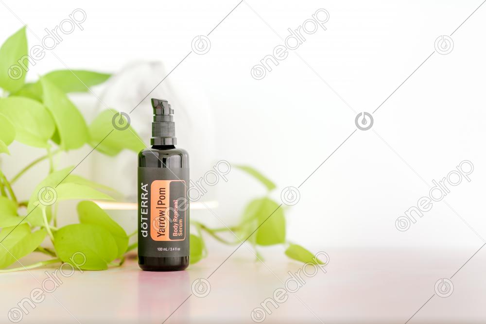 Yarrow|Pom Body Renewal Serum on White Background with Plant
