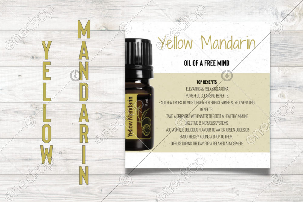 Square infographic with benefits & usage tips of Yellow Mandarin Essential Oil.