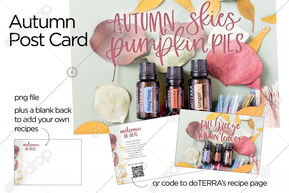 Autumn and Fall Post card with a fall foot scrub recipe and a qr code that leads to the doterra  recipes page.