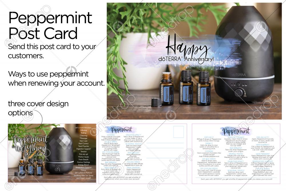 Send this post card to your customers when they renew their doterra wholesale account. Choose from two options. 10 recipes or 15 recipes for how to use peppermint everyday.