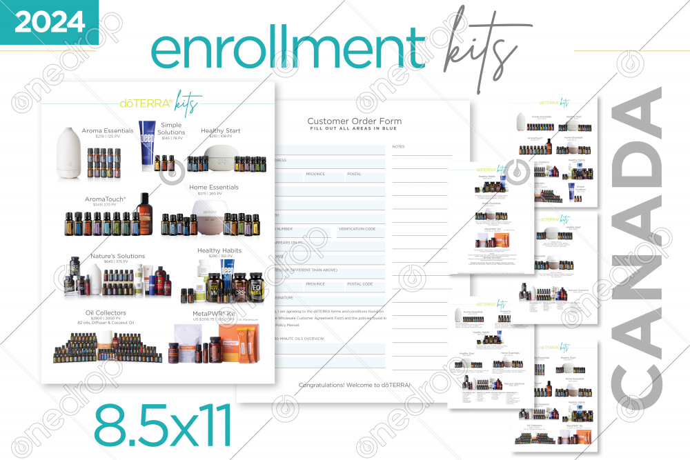 8.5x11 sheets with the current enrollment kits for Canada.Shows pricing and pv and an option with list of items in the kit and without.