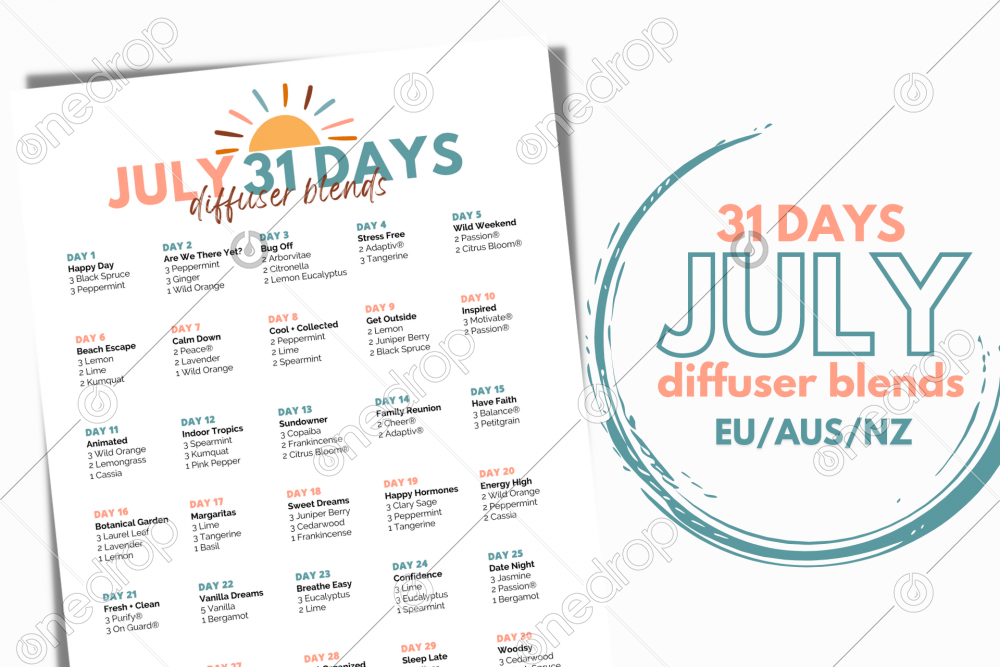 31 Days of July Diffuser Blends. Use as a monthly diffuser challenge or send as a newsletter.
