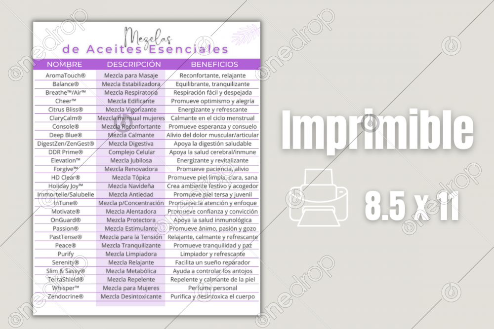 Archivo imprimible en PNG y PDF, tamaño 8,5 x 11 in, con los nombres genéricos y beneficios de todas las Mezclas de Aceites Esenciales de doTerra (de la A a la Z).