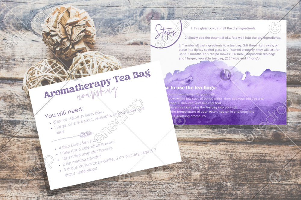 Nourishing Aromatherapy Tea Bag DIY recipe card! Perfect to print at home and keep for yourself, or print them professionally for a fun make + take with your team and customers. This card is part of a full collection of wintertime diy recipes! Check out the full collection of recipe cards right HERE. Each card is 4.25” x 5.5”. If you do print, make sure you choose "2-sided printing". How can you print these so they look professional? 2 ways: These cards can also simply be shared on social media. Please don’t forget to add your logo or website watermark to each card! I left ample room at the bottom of the designs just for you :) And if you ever have questions about printing, shoot me a message:)