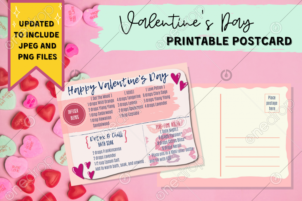 Spread the love with this cute Valentine’s Day postcard. Postcard includes some fun diffuser recipes, Pure-fume roller idea, and a detox bath idea!