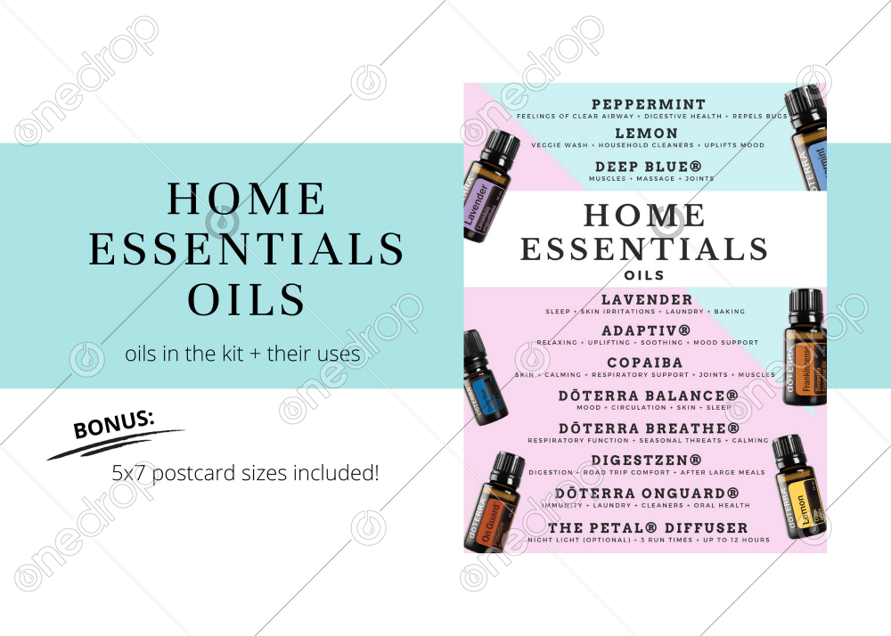 High resolution PDF graphic contains the Home Essentials Kit oils and suggestions for how to use them.  PDF measures 8.5x11.  Available in 4 colors.