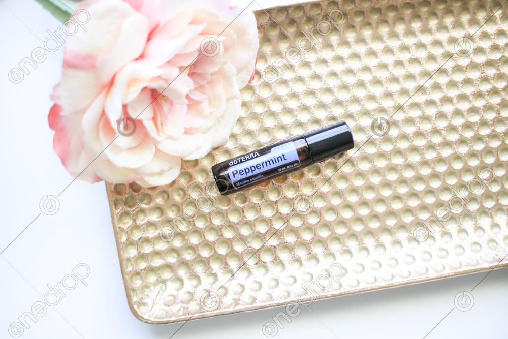 10 mL Roller Bottle of dōTERRA Peppermint on a Gold Tray with Pink Flowers