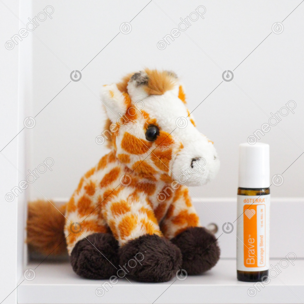 Image of a 10ml Brave Touch roller on a white shelf with a toy giraffe.