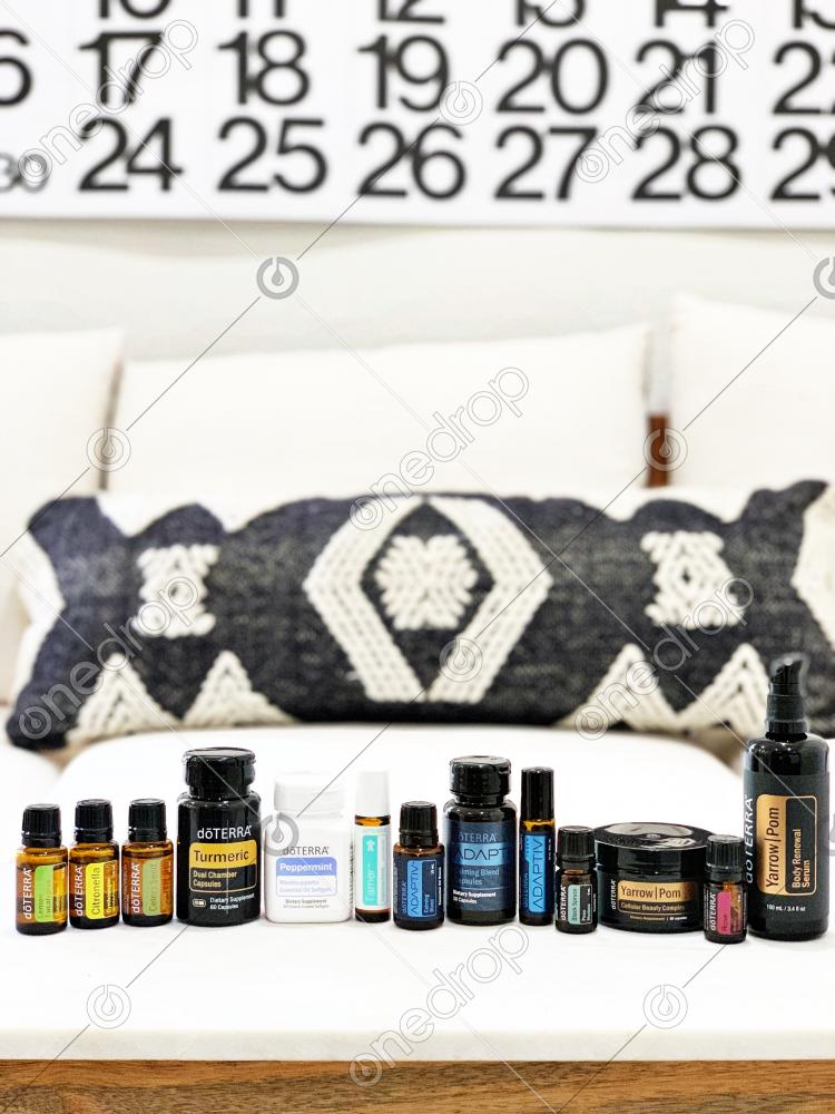 13 Products from Together 2019: Lemon Eucalyptus, Citronella, Celery Seed, Turmeric Dual Chamber Capsules, Peppermint Softgels, Tamer Roller, Adaptiv Collection, Black Spruce, Yarrow/Pom Cellular Beauty Complex, Rose, Yarrow/Pom Body Renewal Serum, in a natural setting.