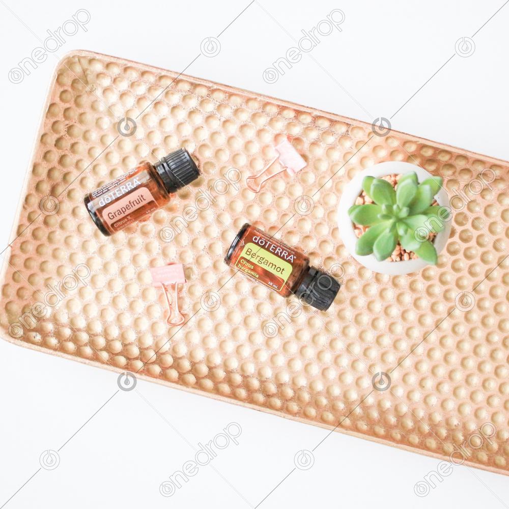 A high resolution image of a 15 ml bottle of Bergamot and Grapefruit essential oil on a gold tray with a succulent. It comes on a white background for a minimalist feel.