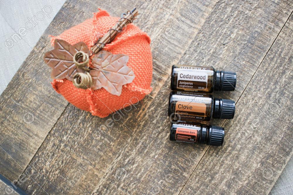 A high resolution image of a 15 mL Bottle of Cedarwood Oil and Clove Oil and a 5 mL Bottle of Cinnamon Bark with a Pumpkin on a wooden tray.