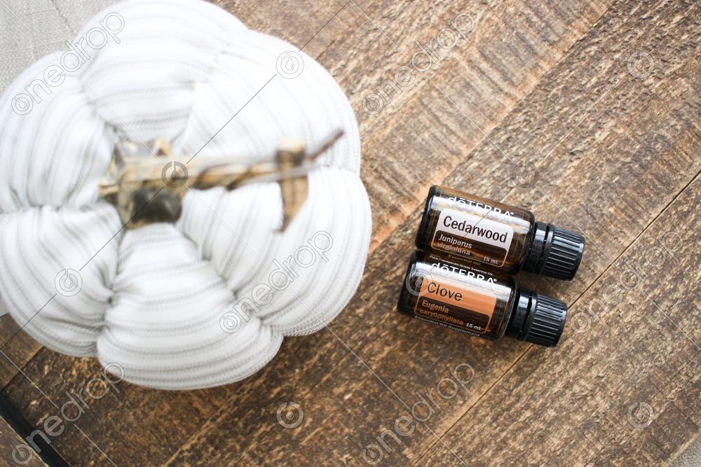A high resolution image of a 15 mL Bottle of Cedarwood Oil and Clove Oil with a White Pumpkin on a wooden tray.