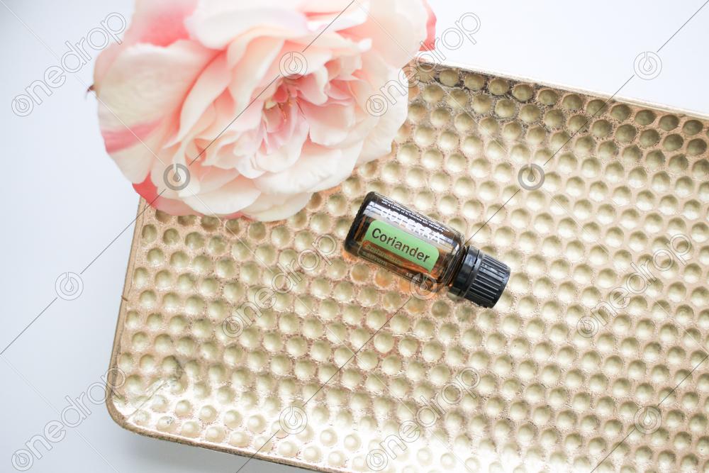 A high resolution image of a 15 ml bottle of Coriander essential oil on a gold tray with pink flowers. It comes on a white background for a minimalist feel.