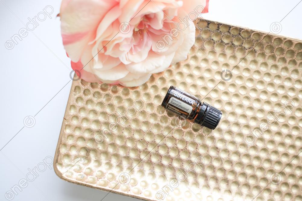 A high resolution image of a 15 ml bottle of Hawaiian Sandalwood essential oil on a gold tray with pink flowers. It comes on a white background for a minimalist feel.
