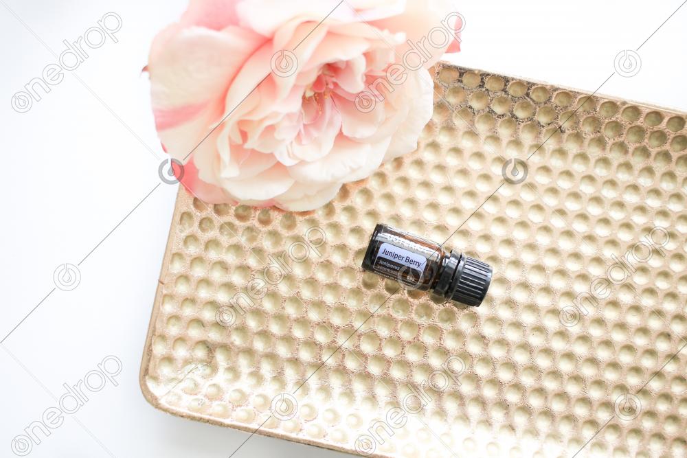 A high resolution image of a 15 ml bottle of Juniper Berry essential oil on a gold tray with pink flowers. It comes on a white background for a minimalist feel.