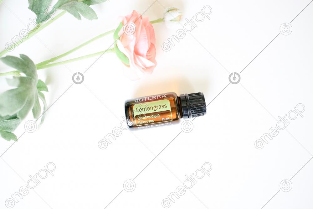 15 mL Bottle of Lemongrass Oil on White Background with Pink Flowers