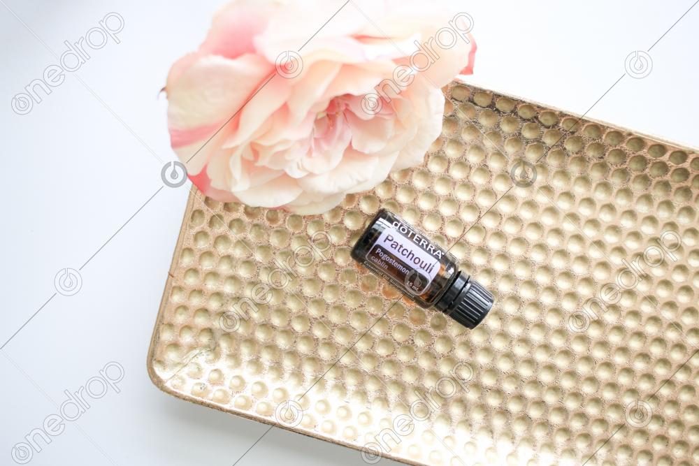 A high resolution image of a 15 ml bottle of Patchouli essential oil on a gold tray with pink flowers. It comes on a white background for a minimalist feel.