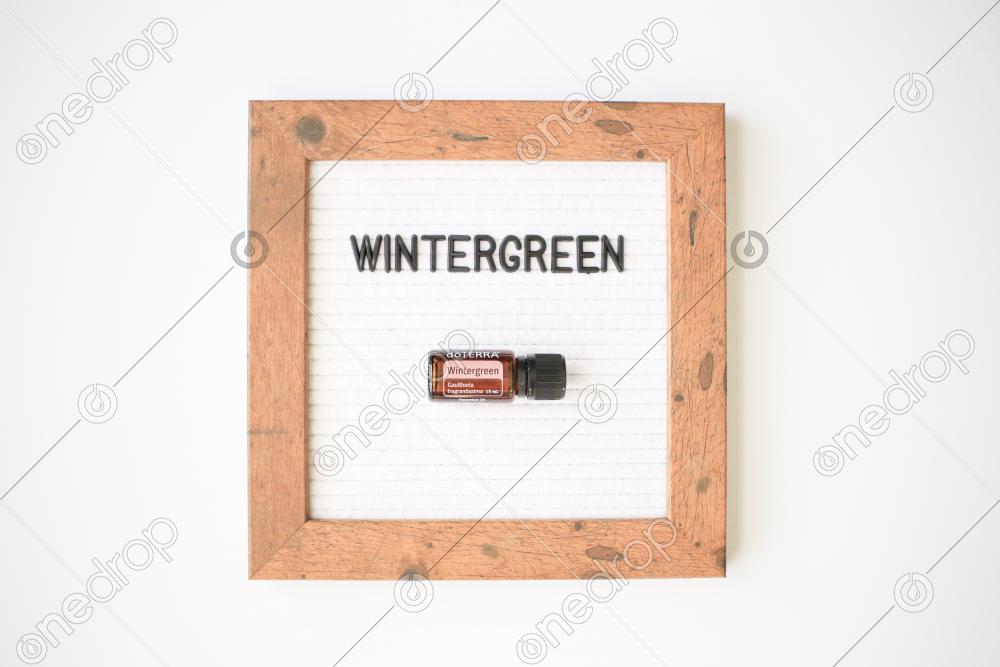 A high resolution image of a 15 ml bottle of Wintergreen essential oil on a letter board. It comes on a white background for a minimalist feel.